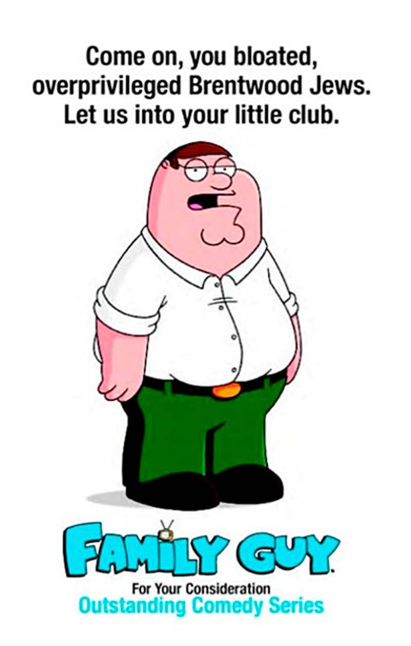 El rey de la censura, Seth MacFarlane, volvió a sufrirla en el año 2012 tras publicar un cartel protagonizado por Peter Griffin en el que se lee "Vamos, inflados y privilegiados judíos de Brentwood [barrio de Los Angeles]. Dejad que nos unamos a vuestro pequeño club".