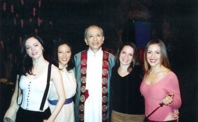 Phoebe (Alyssa Milano), Piper (Holly Marie Combs) y Paige (Rose McGowan) junto a los actores de uno de los capítulos.