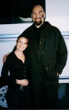 Piper (Holly Marie Combs) y uno de los actores encargados de interpretar a uno de los demonios de la serie.