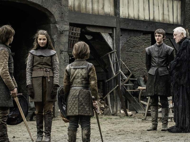 Cuando Bran vuelve a Invernalia en un flashback, Ned le dice a Benjen: "Mantén tu escudo arriba o te golpearé la cabeza como una campana". Es lo mismo que Jon le dice a Olly al inicio de la quinta temporada.