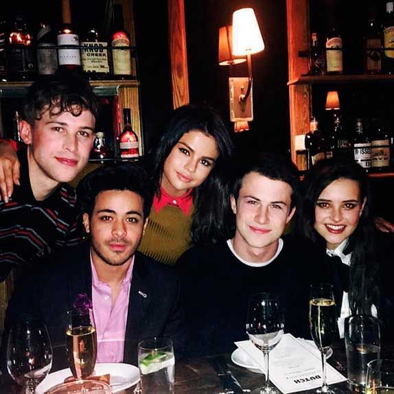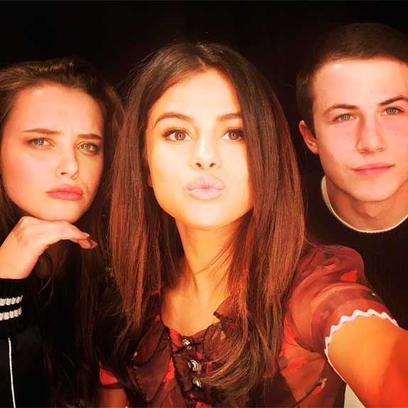 Dylan Minnette (Clay) y Katherine Langford (Hannah) con Selena Gomez