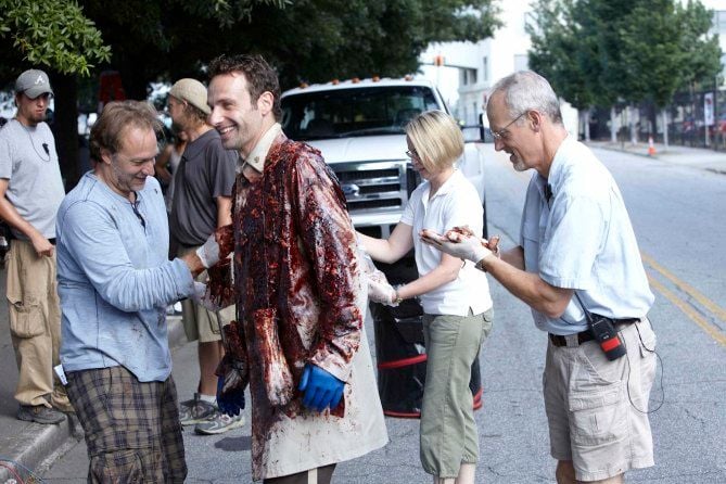 El experto en maquillaje y efectos visuales retoca a Andrew Lincoln para una escena de la primera temporada.