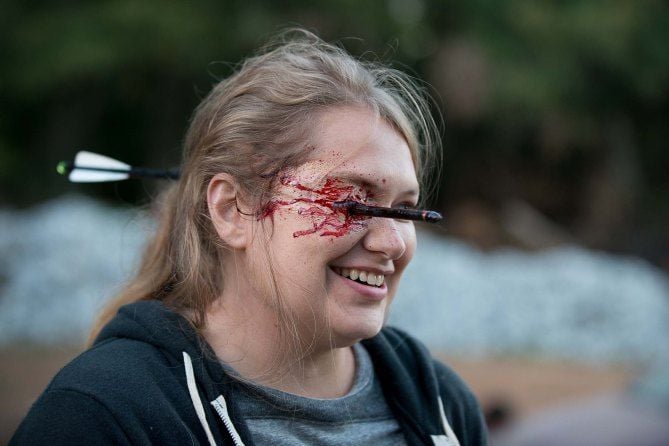Melissa Suzanne McBride bromea con la katana de su compañera de reparto... ¿Sin que se de cuenta?