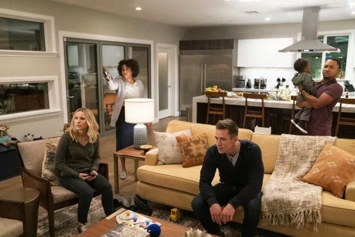 Veronica (Kristen Bell), Logan (Jason Dohring), Wallace (Percy Dags III) y Shae (Keena Wright), cenan tranquilamente cuando algo sucede en la televisión.