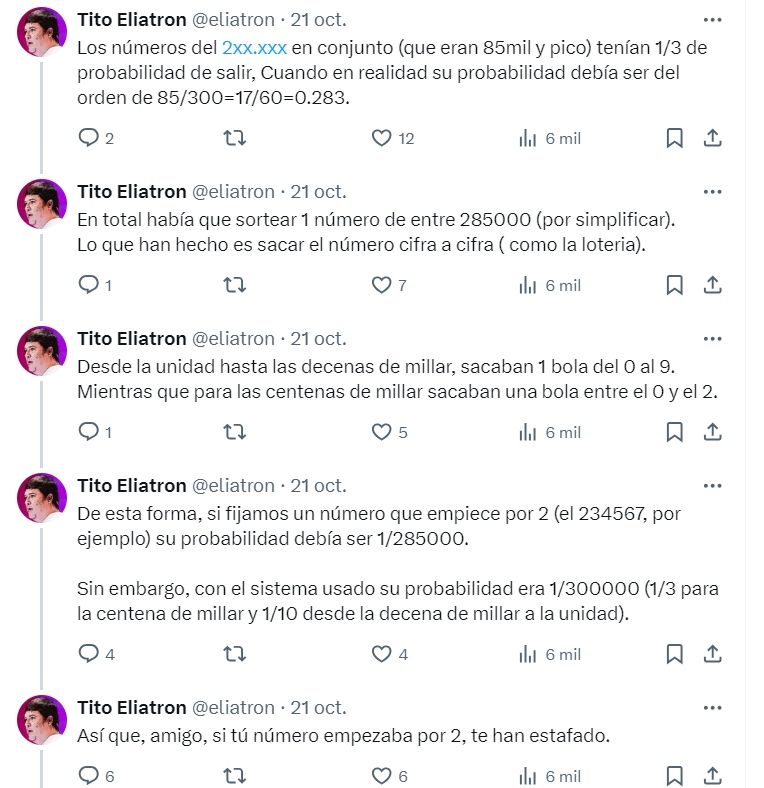 "Si fijamos un número que empiece por 2 (el 234567, por ejemplo) su probabilidad debía ser 1/285000. Sin embargo, con el sistema usado su probabilidad era 1/300000 (1/3 para la centena de millar y 1/10 desde la decena de millar a la unidad)", explicó el profesor de matemáticas en su cuenta de X. "Si tú número empezaba por 2, te han estafado", sentenció el profesor.