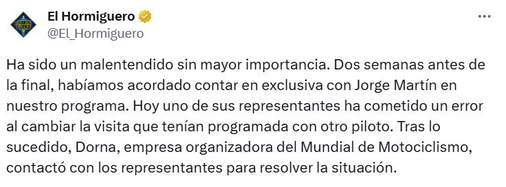 El caso de Jorge Martín es un claro ejemplo. No solo se ha quedado sin hablar de su triunfo en MotoGP en La Revuelta, sino que también muchos espectadores le han puesto en el punto de mira, y como principal culpable, de toda la polémica. Algo que no debería haber ocurrido ya que, como ha señalado su agencia en un comunicado, él solo quiere "compartir su momento con todos vosotros y disfrutarlo juntos".