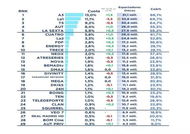 Mientras que la Eurocopa femenina, el Tour de Francia y los Sanfermines dan un buen resultado a La 1, el canal principal de Mediaset sufre a pesar de emitir uno de los eventos deportivos del año: el Mundial de Clubes que fueron bastante buenos en la primera mitad del mes. Telecinco baja un punto respecto a junio, cede cinco décimas frente a julio de 2024 y cae por debajo de su peor marca en julio (un 9,3% en 2023).