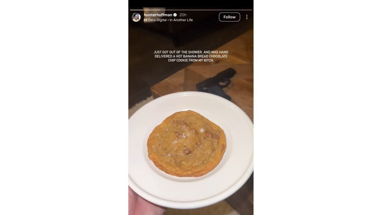 El hilo de Reddit está encabezado por una preciosa foto de lo que parece un mejunte art attack comestible con la siguiente declaración: "Just got out of the shower, and was hand delivered a hot banana bread chocolate chip cookie from my bitch", es decir, algo así como "recién salido de la ducha, y me han ofrecido en mano una galleta de platano con chips de chocolate hecho por mi perra". Suponemos que su perra, de repente, no se ha puesto a dos patas y ha aprendido a cocinar para él: su perra es su mujer. Para alguien que siempre tiene el nombre de Dios en la boca, poco cristiano me parece.