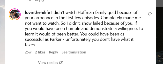 "No quería ver Hoffman Family Gold por tu arrogancia en los primeros episodios. Me hizo no querer verlo por completo. El programa fracasó por tu culpa. Si hubieras sido más humilde y hubieras demostrado intención de aprender hubiera sido mejor. Podrías haber sido tan exitoso como Parker. Por desgracia, no tienes lo que se necesita", escribe una usuaria en su cuenta de Instagram.