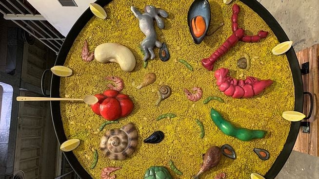 La canción daba paso también a otra de las imágenes icónicas del programa, una ruleta gigante en forma de paella valenciana llamada 'La paella rusa'. Esta ruleta estaba compuesta de números, compartimentos y recipientes con premios y sorpresas. Los concursantes elegían opciones vinculadas a la paella (números, cazos, porciones simbólicas), y de ahí salían premios en metálico, regalos o pruebas extra.